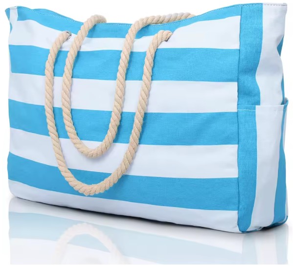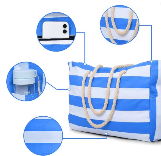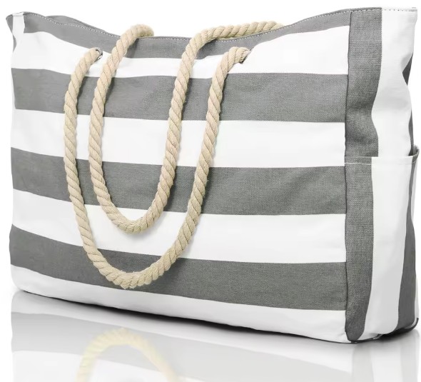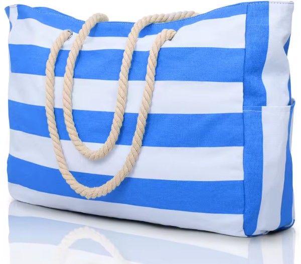 Denne romslige strand bagen i kraftig stripet canvas stoff er foret med vannavstøtende stoff innvendig og er super å ha med på stranda eller på tur.